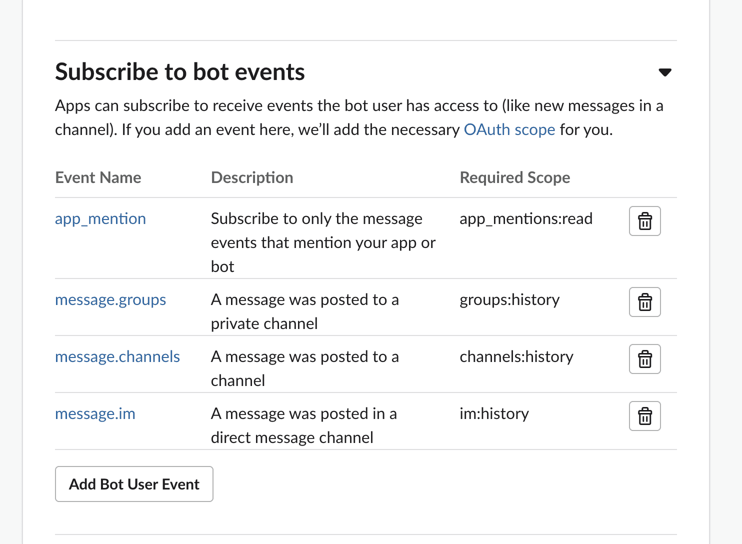 . Scroll to Subscribe to bot events, and pick app_mention, message.groups, message.channels and message.im